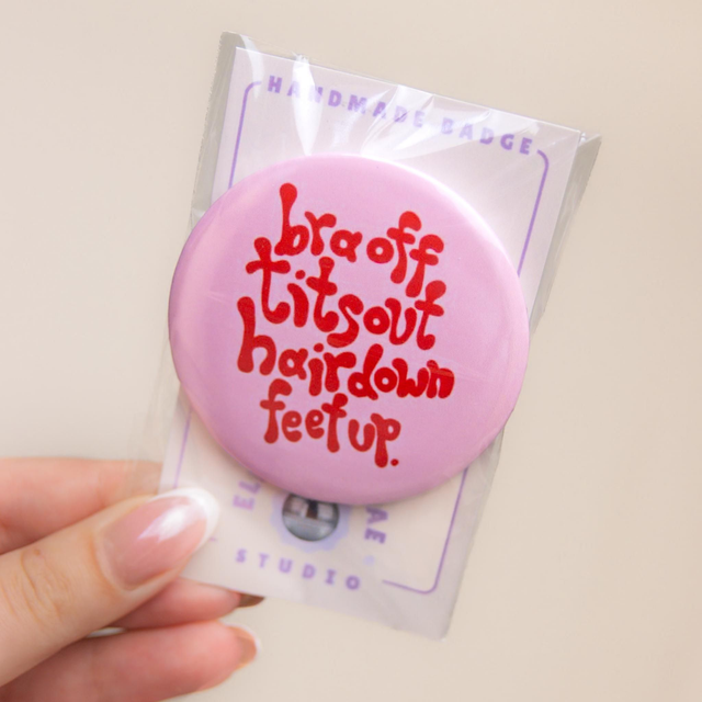 'Bra Off, Tits Out, Hair Down, Feet Up' - Large Badge