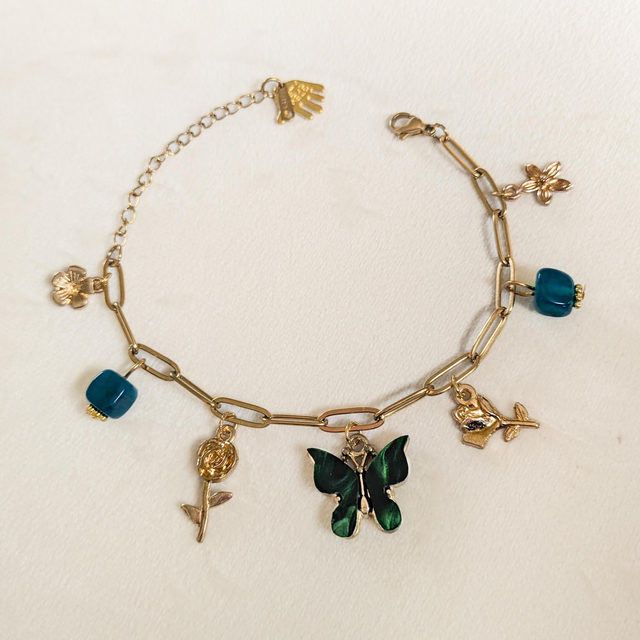 Featuring a stunning gold paperclip style chain. This bracelet includes a range of gold and green stone charms, finished with a deep green butterfly.