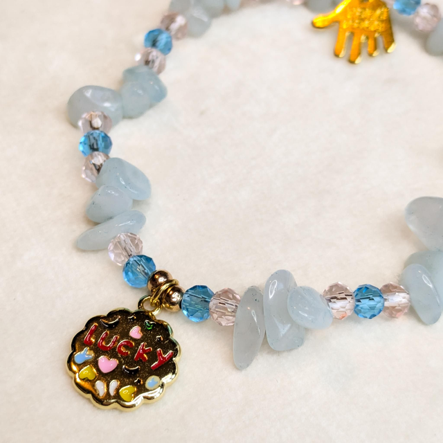Featuring a stunning mix of crystal beads and natural crystal stones. These bracelets shimmer beautifully in any light. This bracelet includes a double sided gold charm that features the words 'Lucky' and 'Love'. The perfect good luck charm!