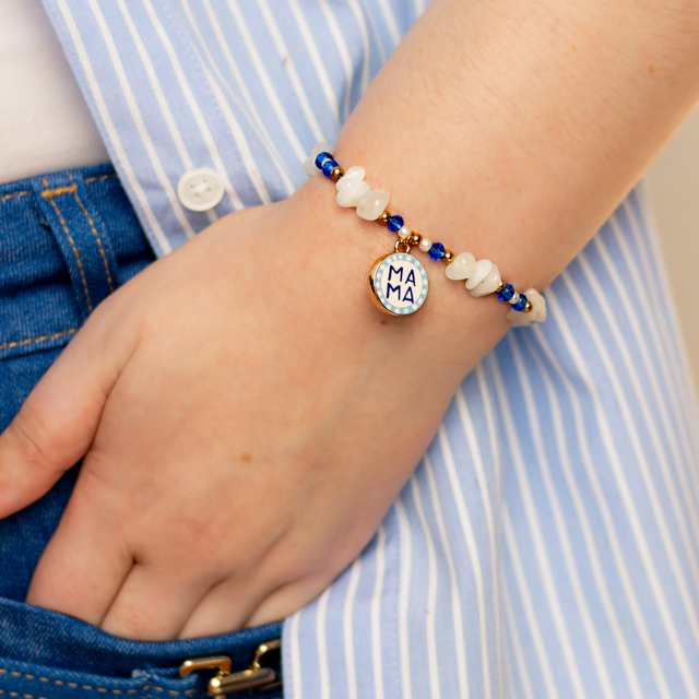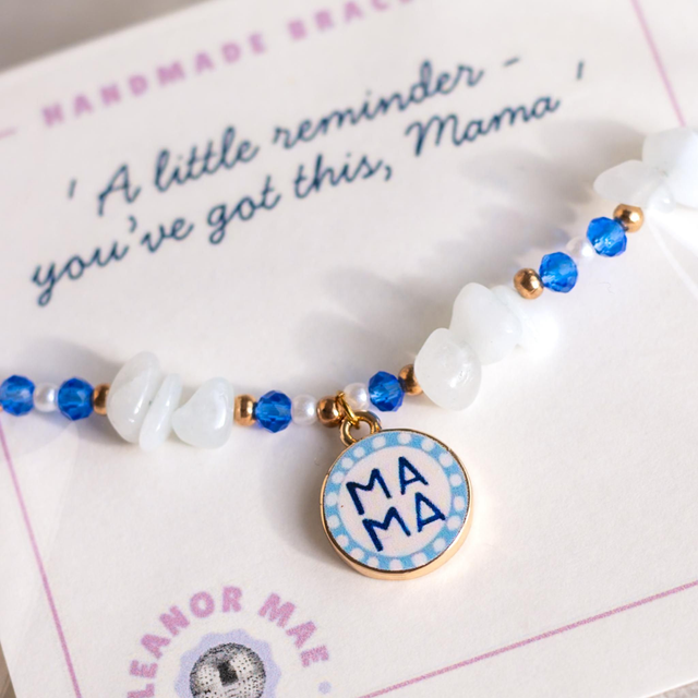 Featuring a stunning mix of crystal beads and natural crystal stones. These bracelets shimmer beautifully in any light. This bracelet includes a gold and blue charm delicately decorated with 'Mama'. The perfect gift for that special Mum!