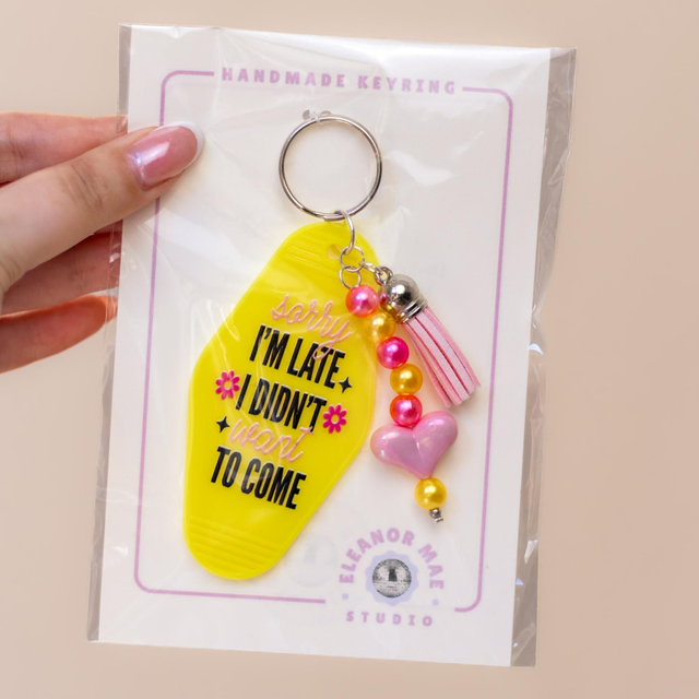 Add a touch of retro charm with my handmade motel-style keyrings, each designed to make you smile. Every keyring features a bold and witty or sweet and sentimental quote, making it the perfect accessory for your keys, bags, or as a thoughtful gift.