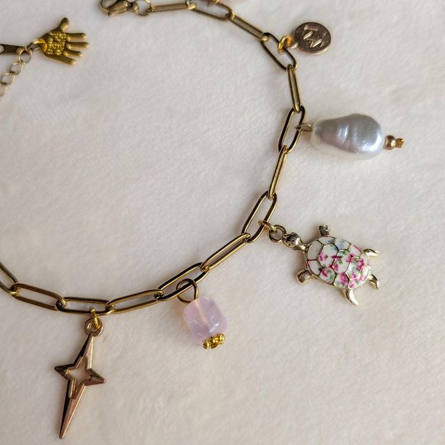 Featuring a stunning gold paperclip style chain. This bracelet includes a range of gold and pearl charms, finished off with a gold turtle charm.